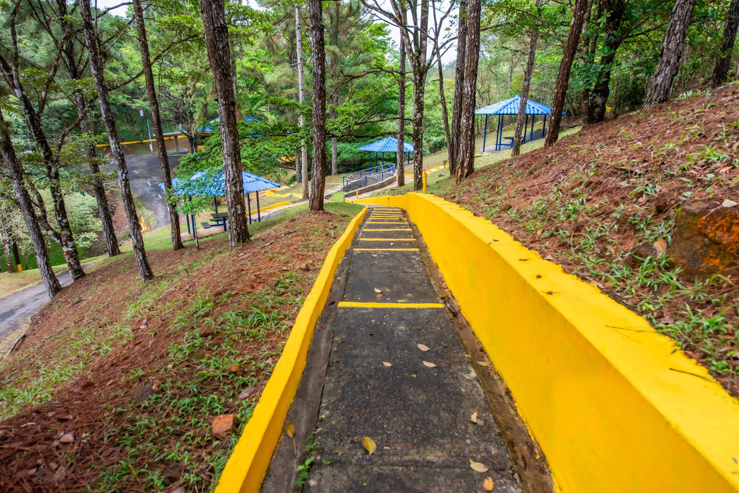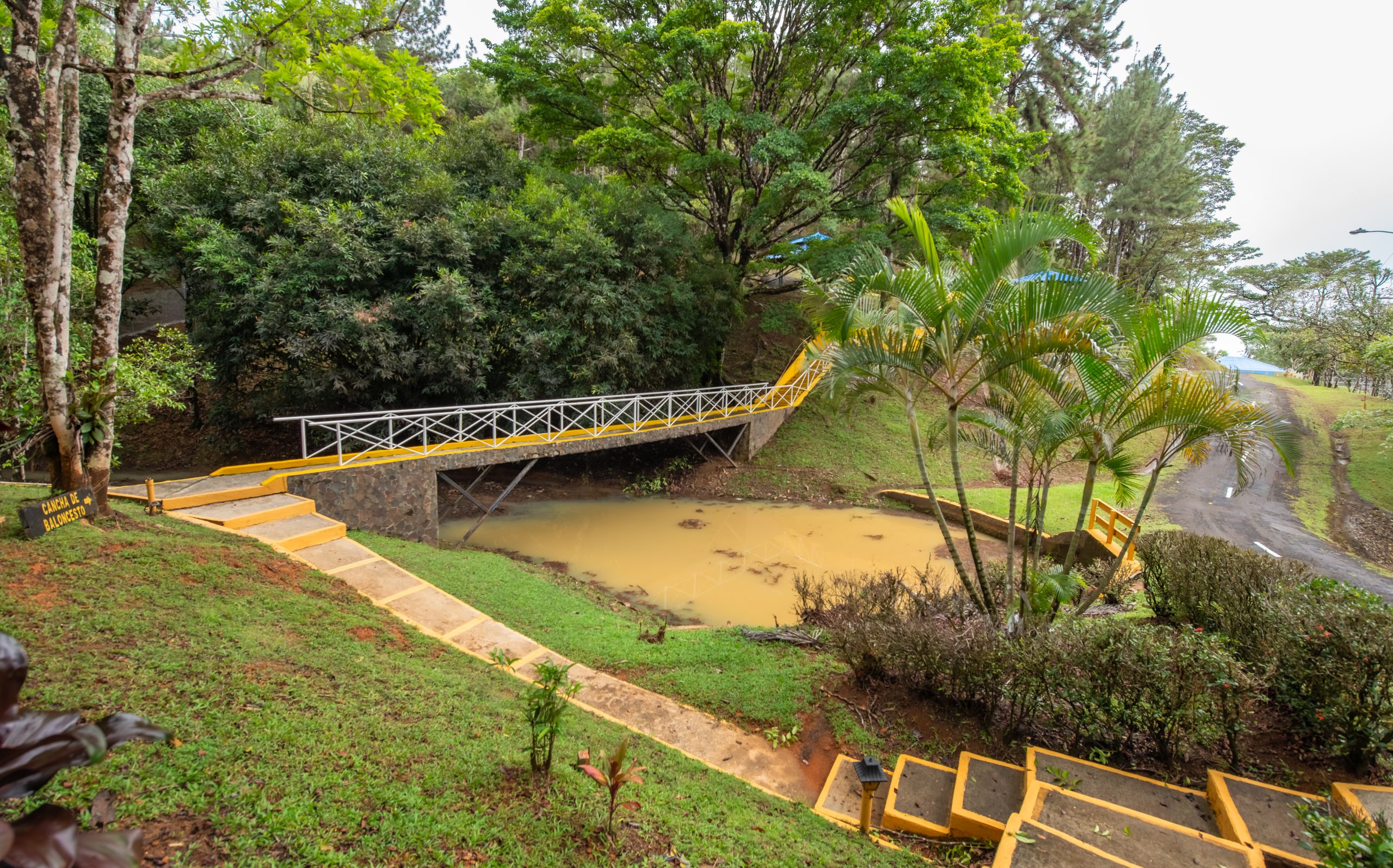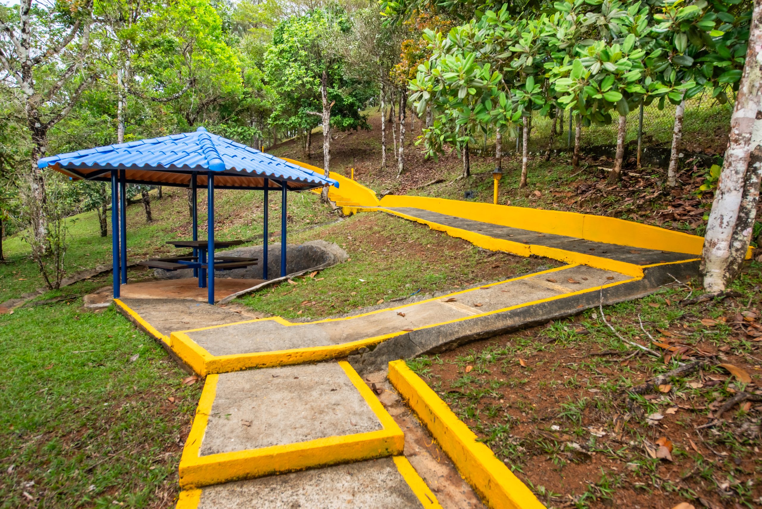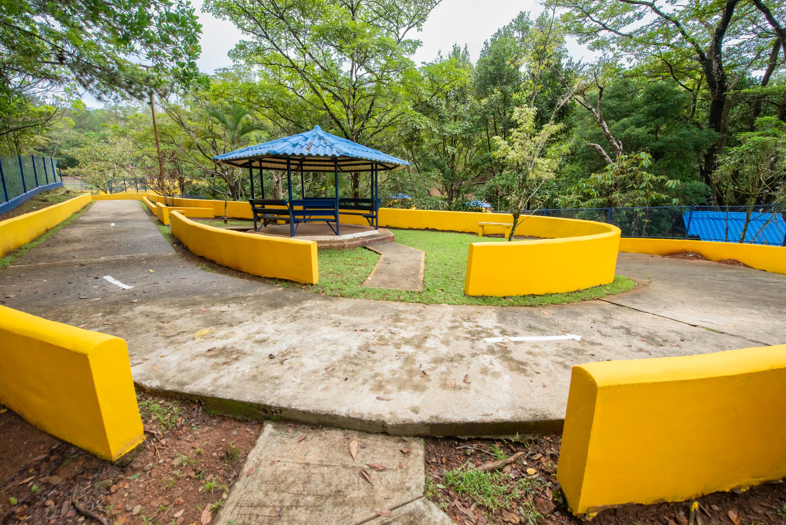 El área cuenta con Gazebos, salón biblioteca, una pista para patinaje, veredas, escalinatas y puentes para disfrutar del área.