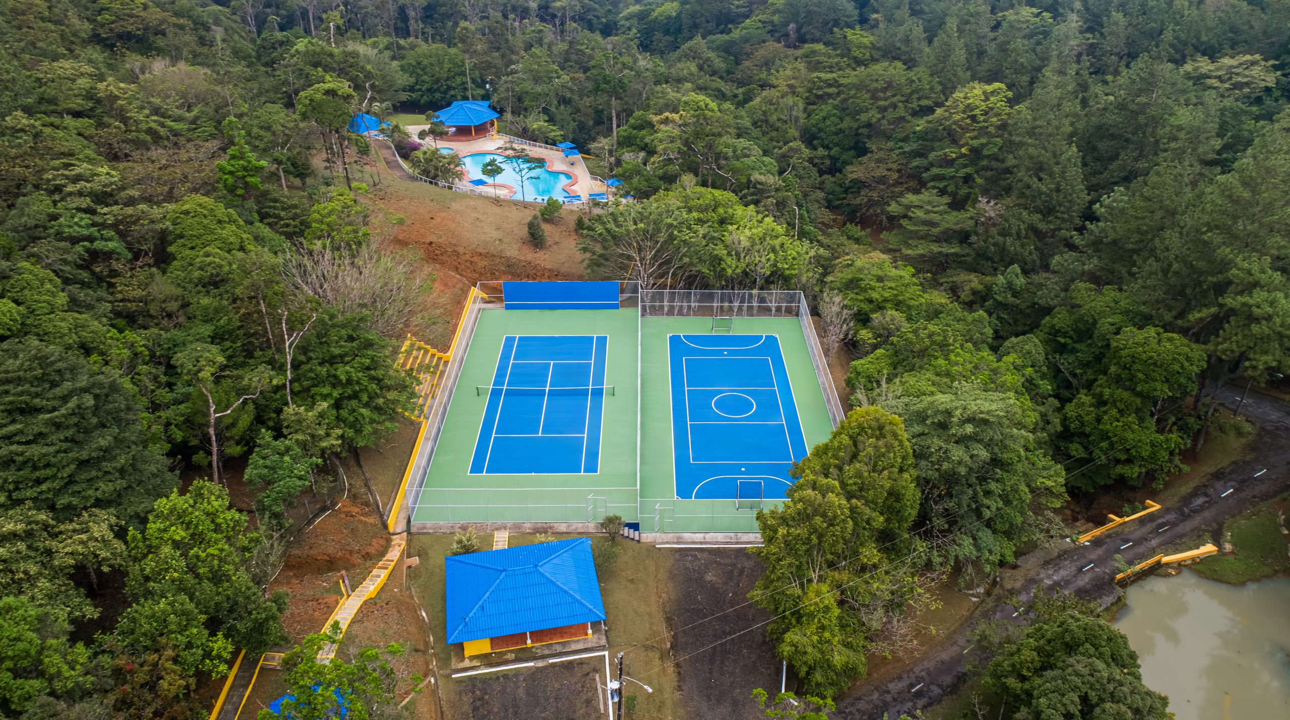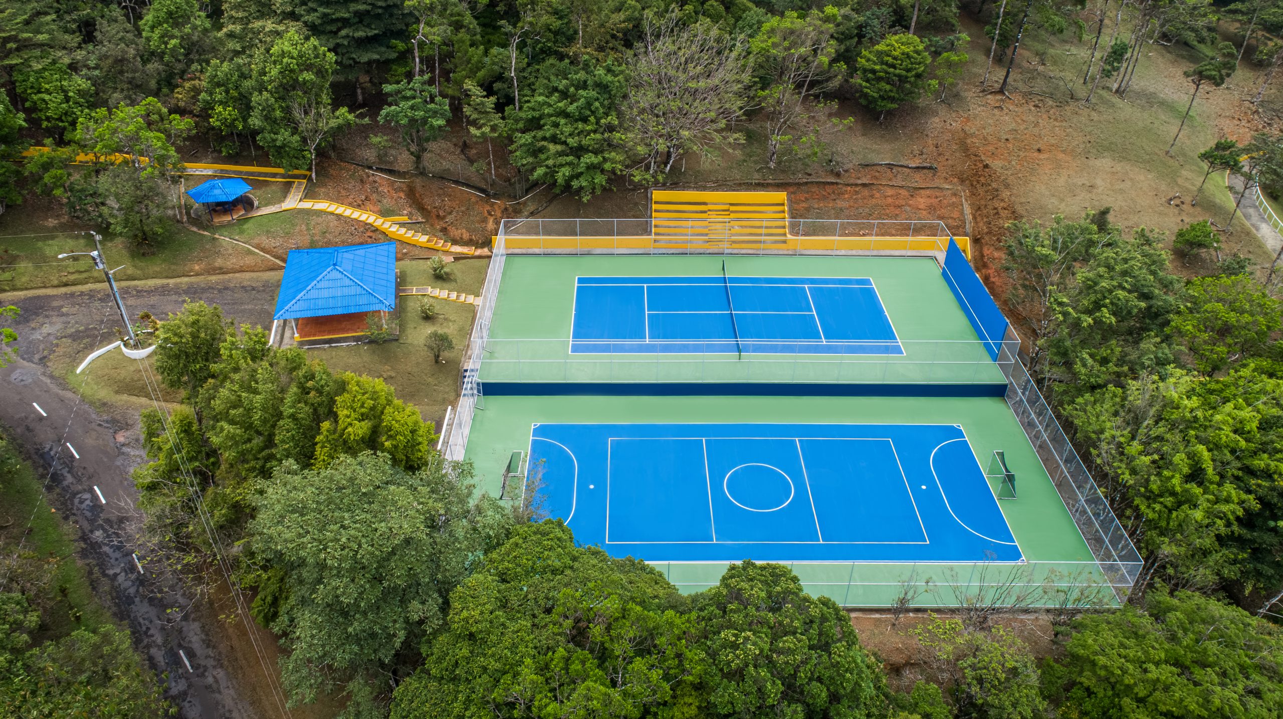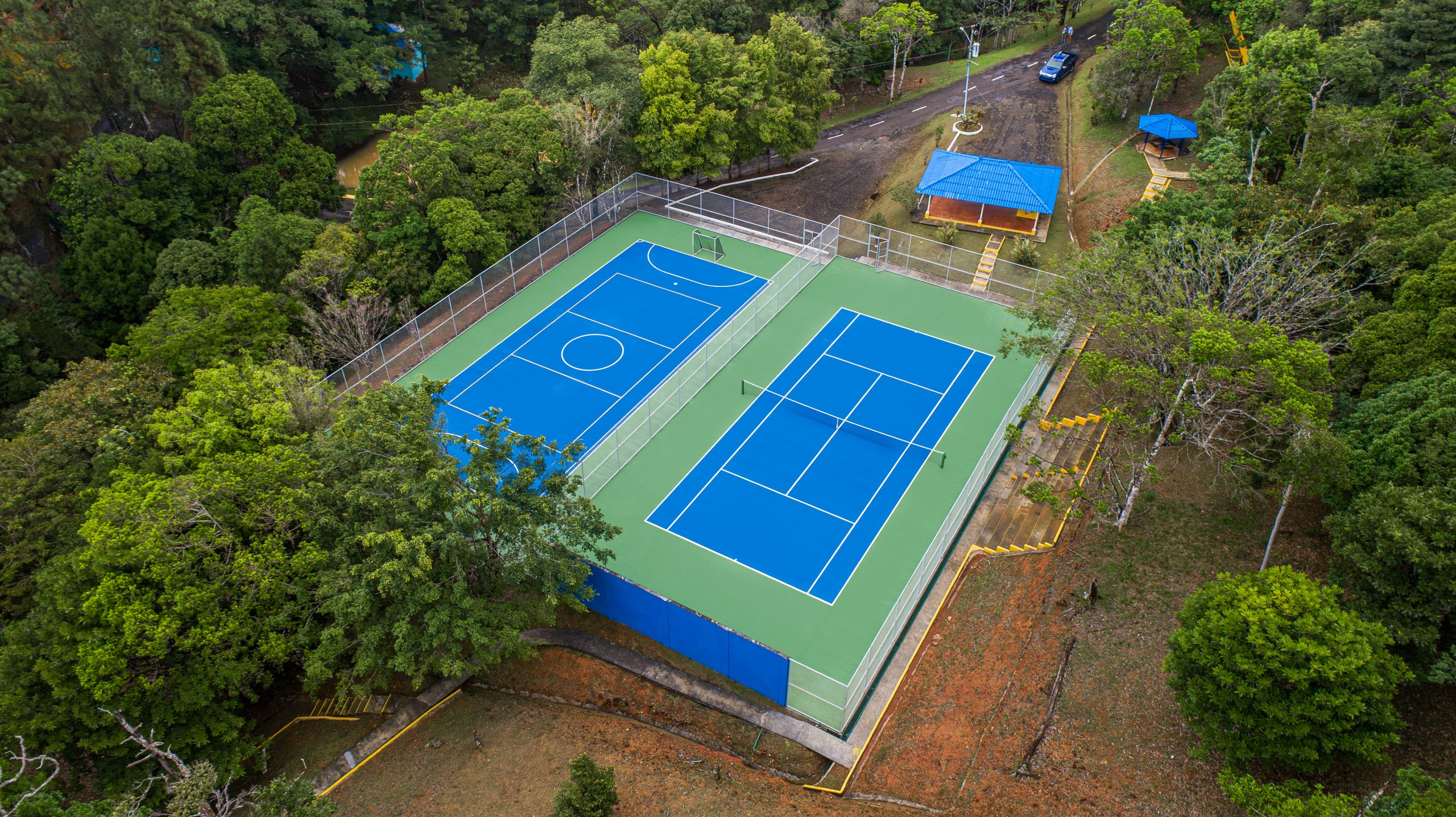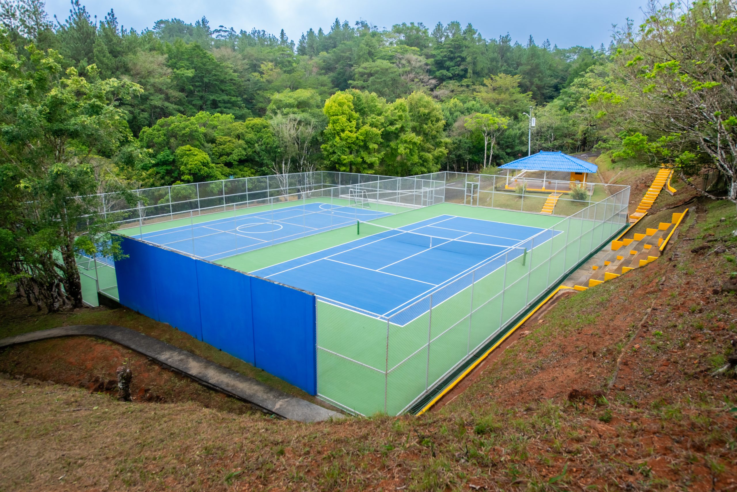 La cancha de tenis – futsala, cuenta con malla de ciclón, muro de frontenis y gradería.