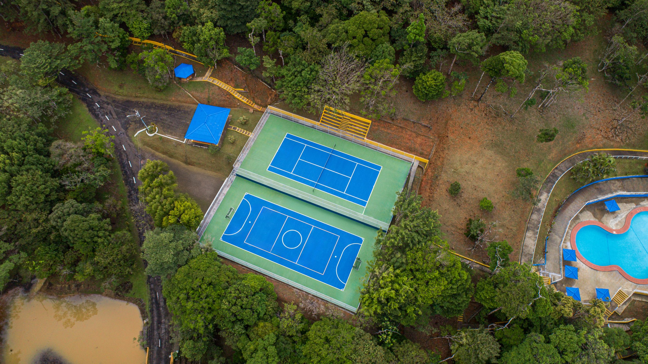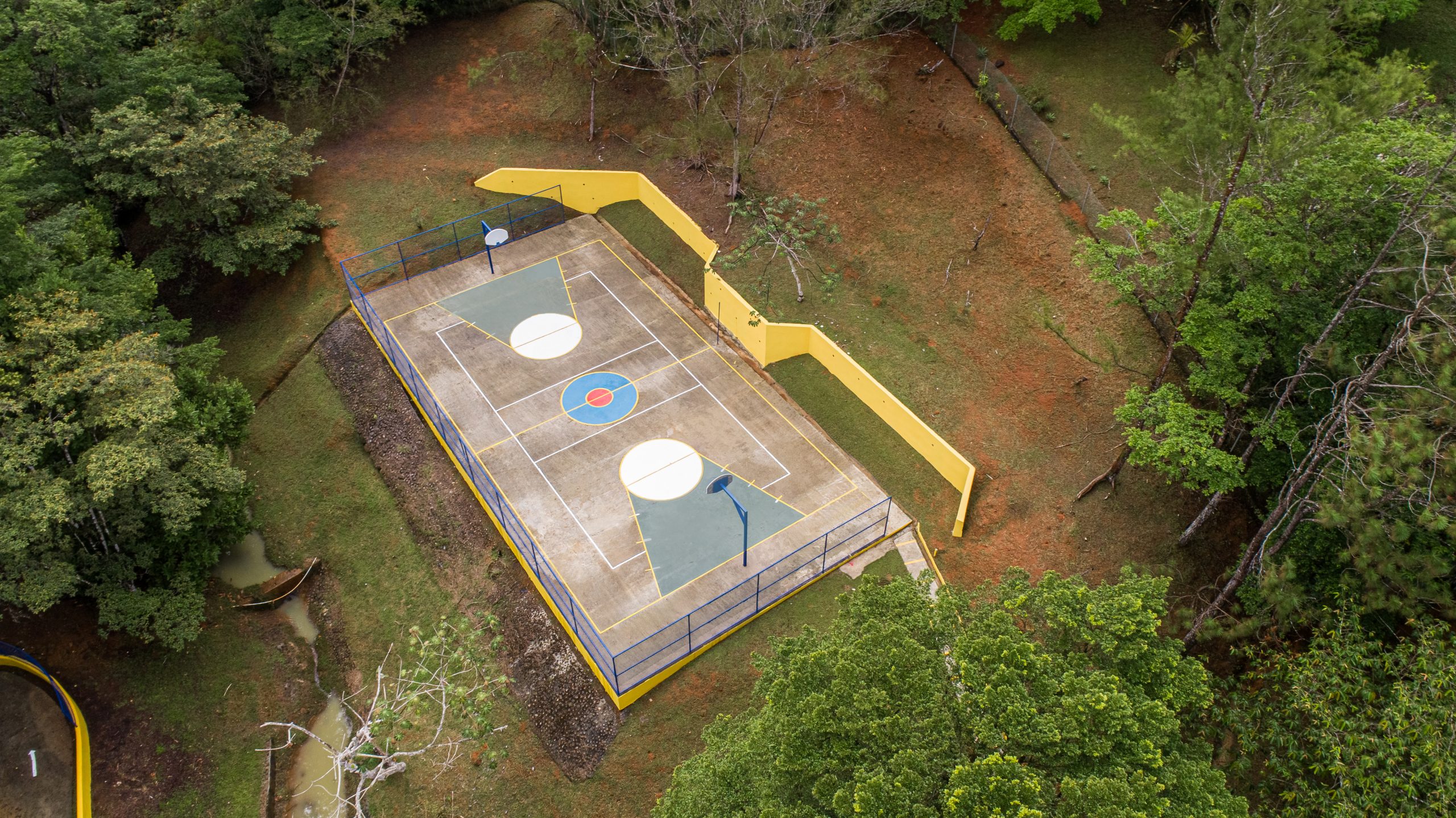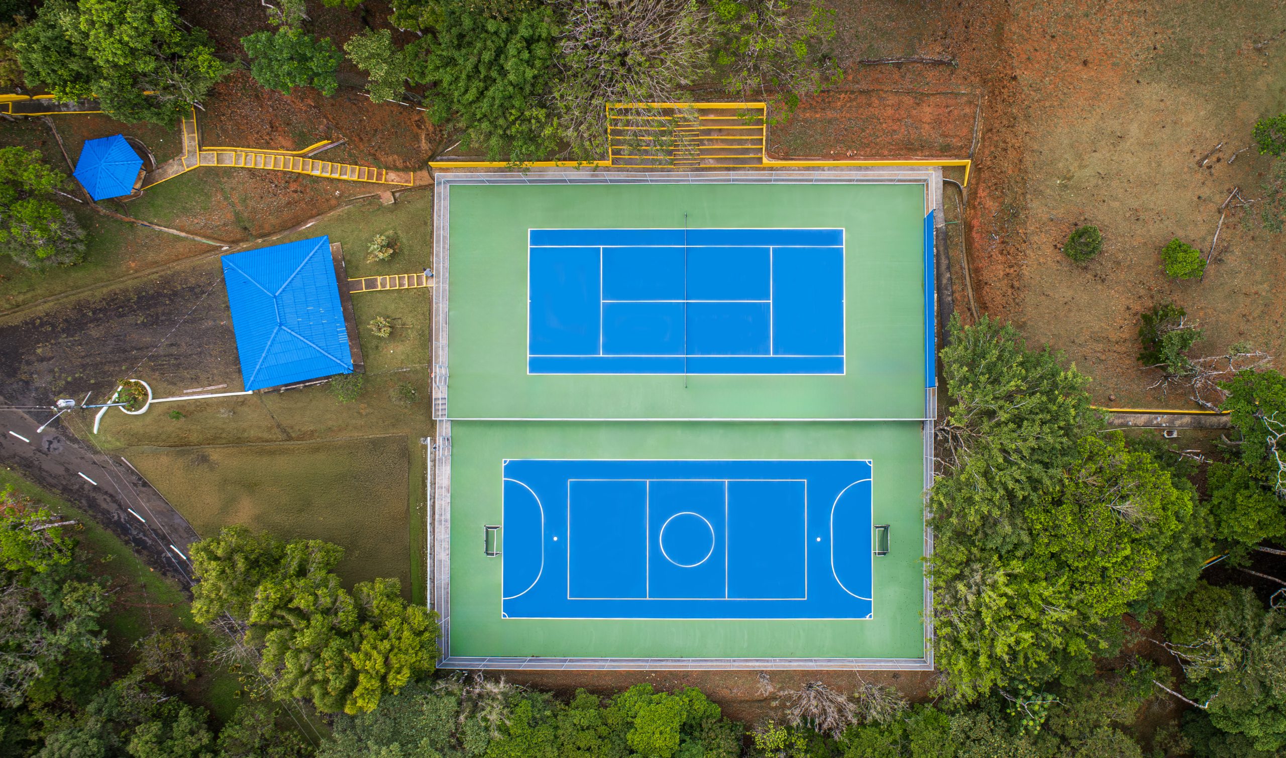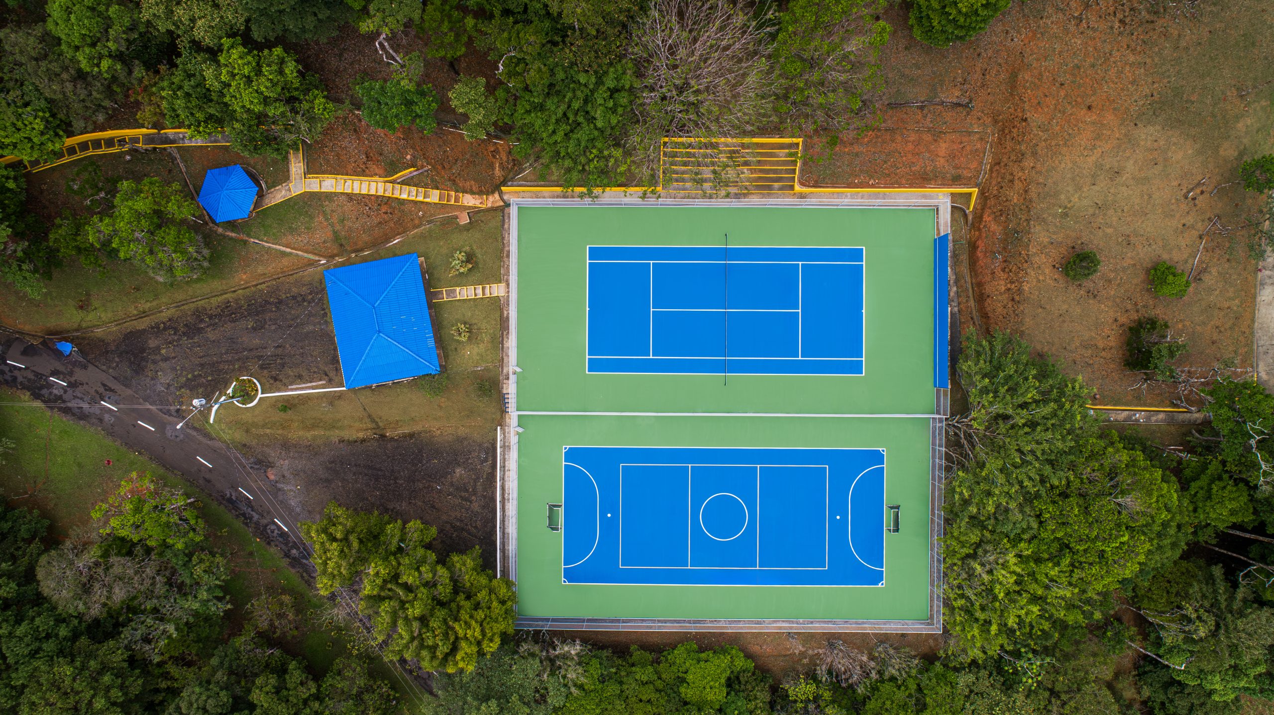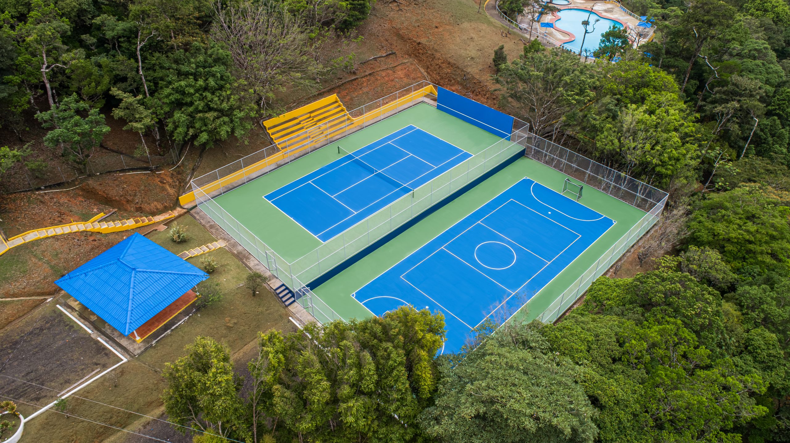 La cancha de tenis – futsala, cuenta con malla de ciclón, muro de frontenis y gradería.